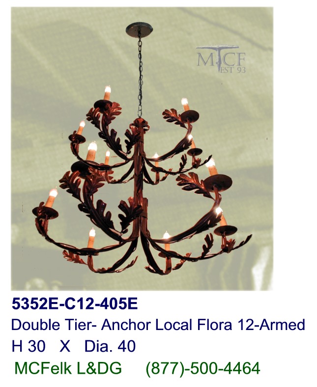 Takes 12-60Watt max. elc. candles,(includes #405 canopy kit) {Options: Hickory leaf and or choice other floral parts, up to 4 per arm with acorns other like prts., etc.} Features hammered limbs formed to run length of arm with hammered attached leafs.