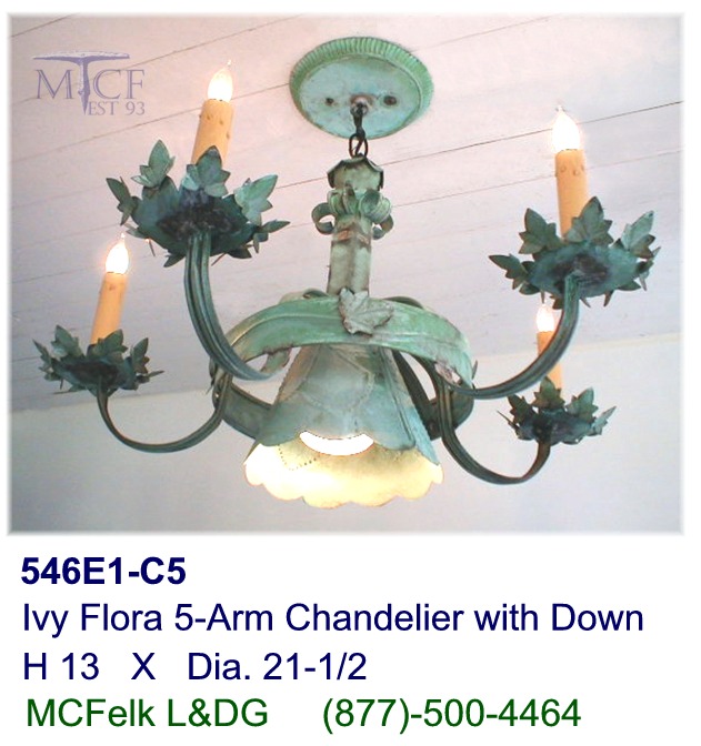 Takes 8-60Watt Elc.Cndles. (Includes: Hammered floral leaf art detail with vinage,  36in hang Chain.)  Includes: #425E canopy kit with 8ga. black or pewter chain. Upgrades: Down light configuration available contact for design requirements.