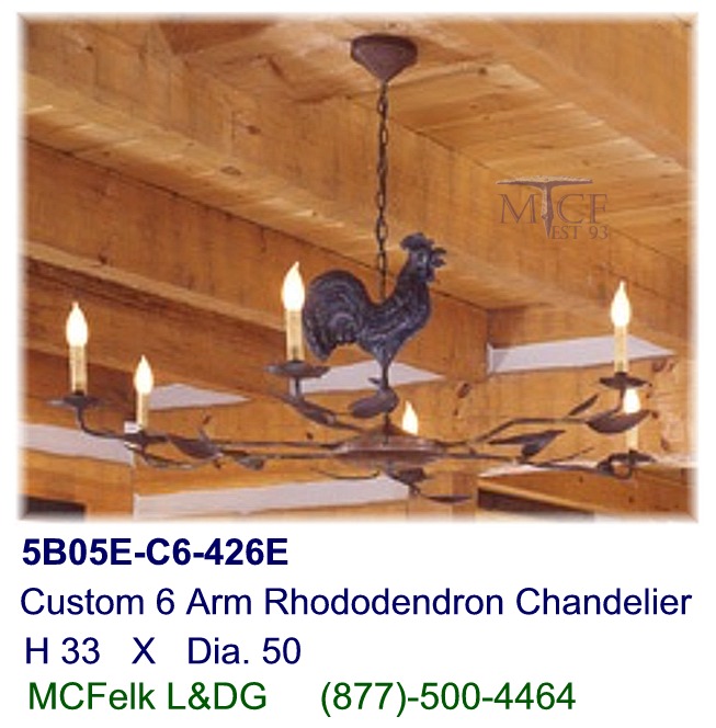 Takes- 6 at 60watt max. candelabra bulbs. Includes: Handcrafted copper tubular 3/8 Nom. dia arms, textured having natural elements in life like stems and Rhod. leafs, plus custom canopy included. Features: Sculpted Rhod. blossom bobesche with hammered animal sculptured silhouette center as supported by stem at hub assembly, Wild Turkey or other Nom. 8in x 12in ht.