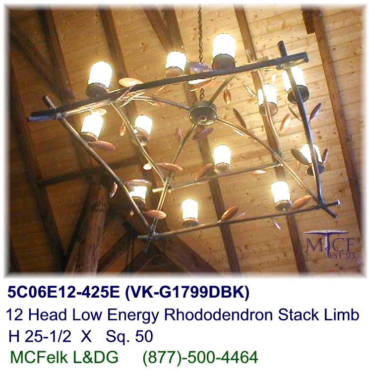 Includes: Handcrafted copper 3/4 to 1" tubular Nom. dia Limbage, custom fine or coarse engraved textured bark, having natural elements in life like stems and Rhod. leafs, plus heavy duty #425E canopy kit with 12ft of heavy #6 solid brass chain. Features: 12 each Custom waivy hand blown glass fitter replacement part #VK-G1799DBK. CPF or standard bulb assessory items optional.